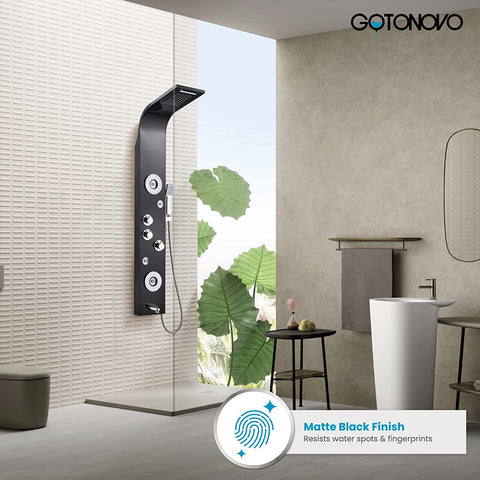 304 Stainless Steel Wall Mount Shower Panel Tower System Multiple Functions Black Waterfall Rain Massage System with Body Jets Nozzles Rainfall Shower Head and Tub Spout Multiple Functions