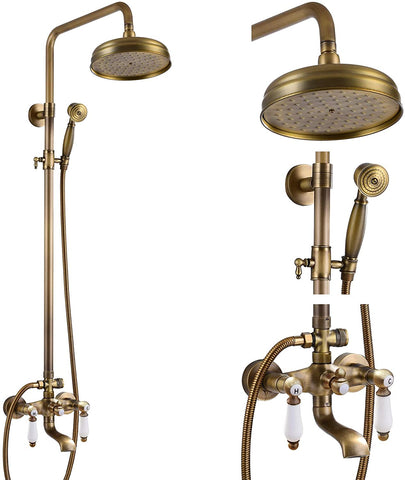 Antique Brass Shower Faucet 8-inch Shower Head Fixture with Handheld Spray Double Lever Handle Bathtub Spout Triple Function Bathroom Wall Mount