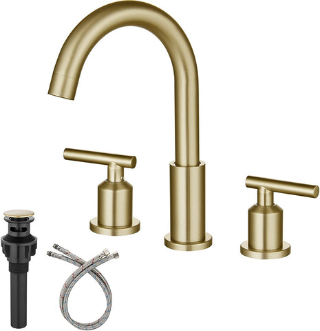 gotonovo 3 Hole Deck Mount 8 Inch Widespread Bathroom Faucet Lavatory Basin Bathroom Sink Faucet with Hot and Cold Mixer Valves Brushed Gold with Pop Up Drain Double Lever Handles