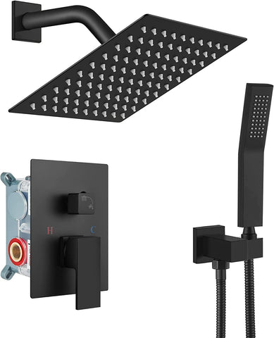 gotonovo Matt Black Shower System Bathroom Shower Faucet Set Wall Mounted 8 Inch Square Rainfall Shower Head 2-Function Single Handle and Hand Held Spray with Rough-in Valve and Shower Trim Included