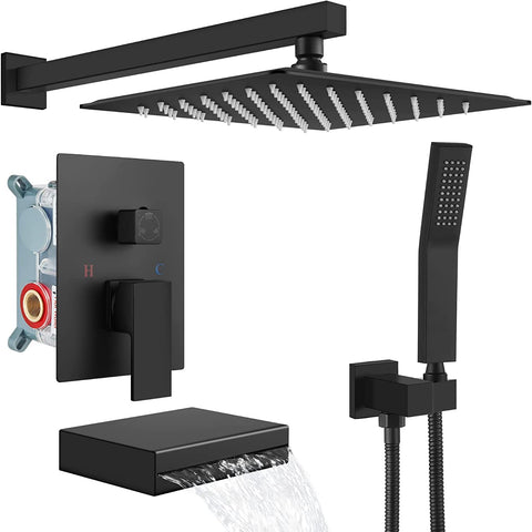 gotonovo Matte Black Rain Mixer Shower Faucet Set Waterfall Tub Spout with 12 inch Square Rainfall Shower Head and Handheld Spray Wall Mounted Rough-in Valve and Trim Included