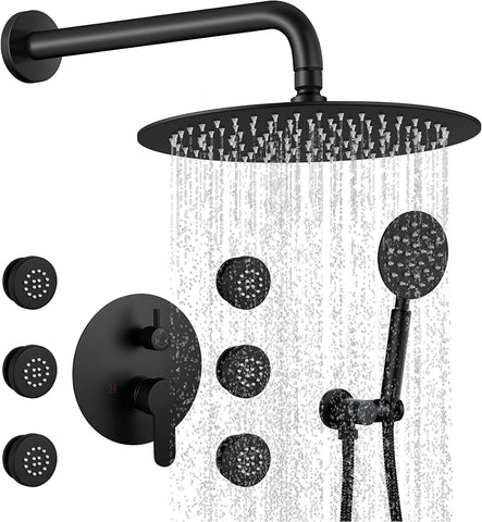 - 【HIGH-QUALITY MATERIAL】:High quality stainless steel rain shower head,matte black finish ensure quality and longevity. Rough-in valve ,handheld shower and body jets are constructed from solid brass.