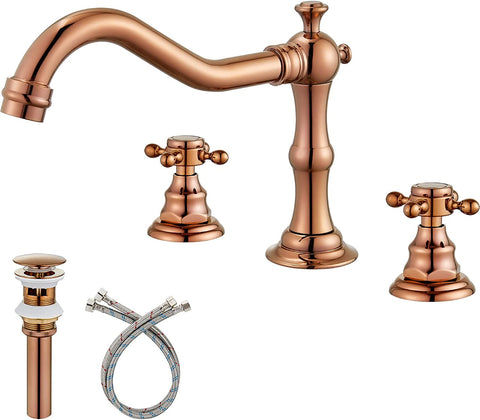 Widespread Bathroom Faucet Rose Gold 3 Holes Deck Mounted Basin Mixer Tap with Pop Up Drain Assembly with Overflow Victorian Style Dual Cross Knobs Hot and Cold Water
