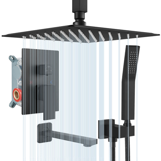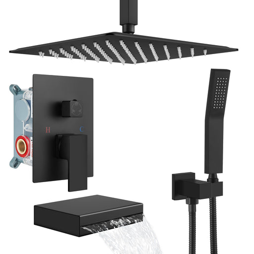 Original price $249.99 - Original price $249.99Original price$249.99$249.99 - $249.99Current price $249.99gotonovo Matte Black Rain Mixer Shower Faucet Set Waterfall Tub Spout with 10 inch Square Rainfall Shower Head and Handheld Spray Ceiling Mounted Pressure Balance Rough-in Valve and Trim Included【HIGH-QUALITY MATERIAL】:High quality staineless steel rain shower head,matte black finish ensure quality and longevity. Rough-in valve constructed... View full detailsOriginal price $249.99 - Original price $249.99Original price$249.99$249.99 - $249.99Current price $249.99Save 0% Save %