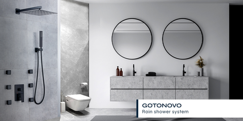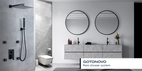 gotonovo Regenmixer Douchekraan Set 12 inch Vierkante Regendouche met Body Spray Jets en Messing Handdouche Matzwarte Wandmontage Drukbalans Ruw-in Klep en Trim Inbegrepen